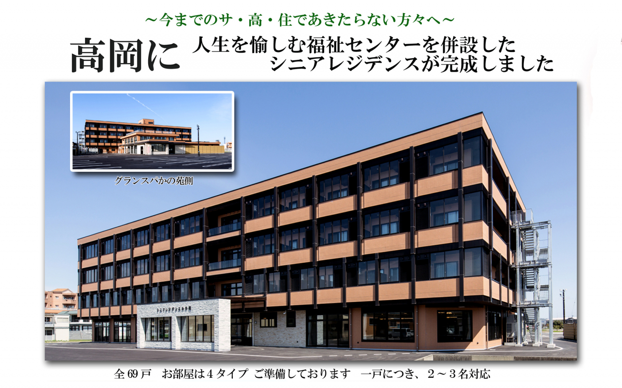 社会福祉法人が運営するシニアレジデンスかの苑は、富山県高岡市にある広大な苑庭を持つ自然環境豊かなサービス付き高齢者向け住宅です。