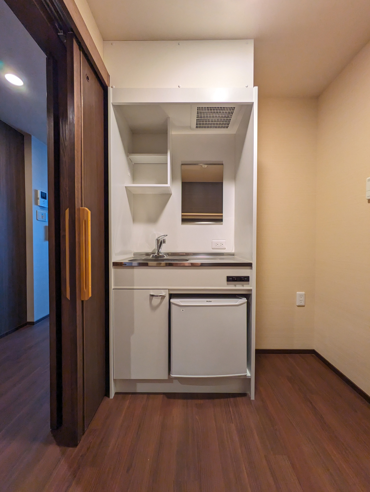 キッチンには、ミニ冷蔵庫も完備。すっきりと使いやすい作りとなっております。
