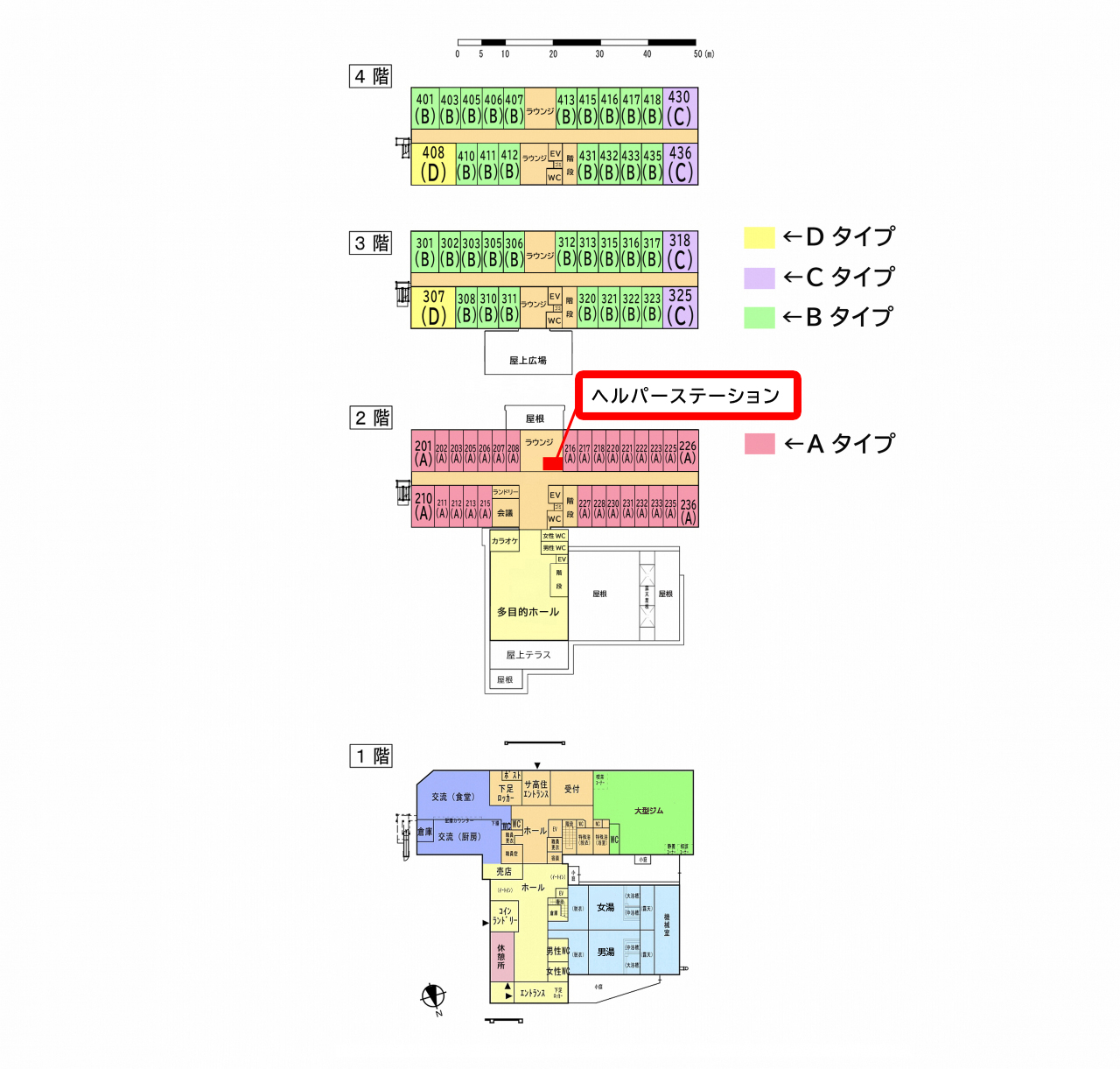 2階にはヘルパーステーション、各階には入居者様専用のラウンジがあります。