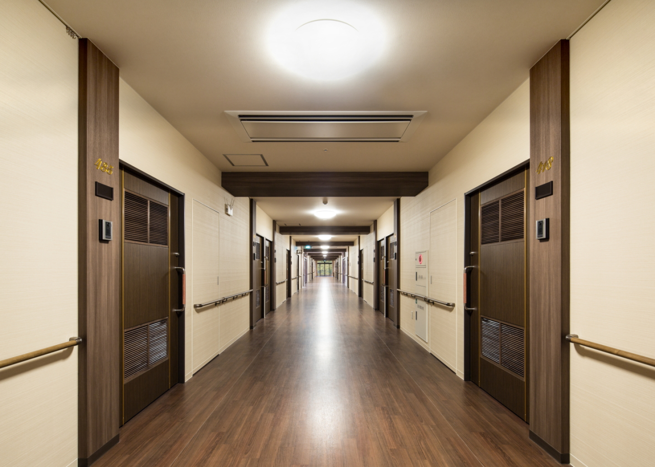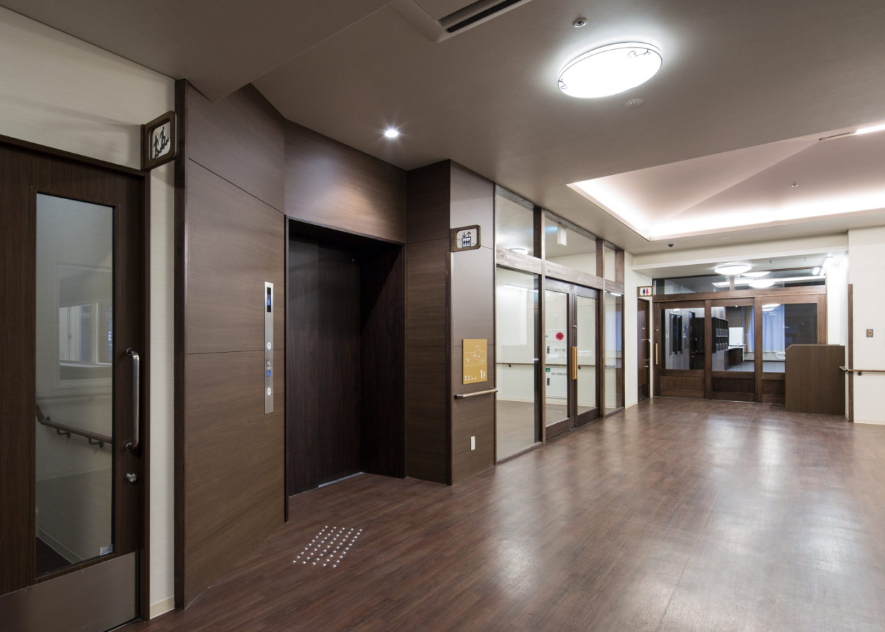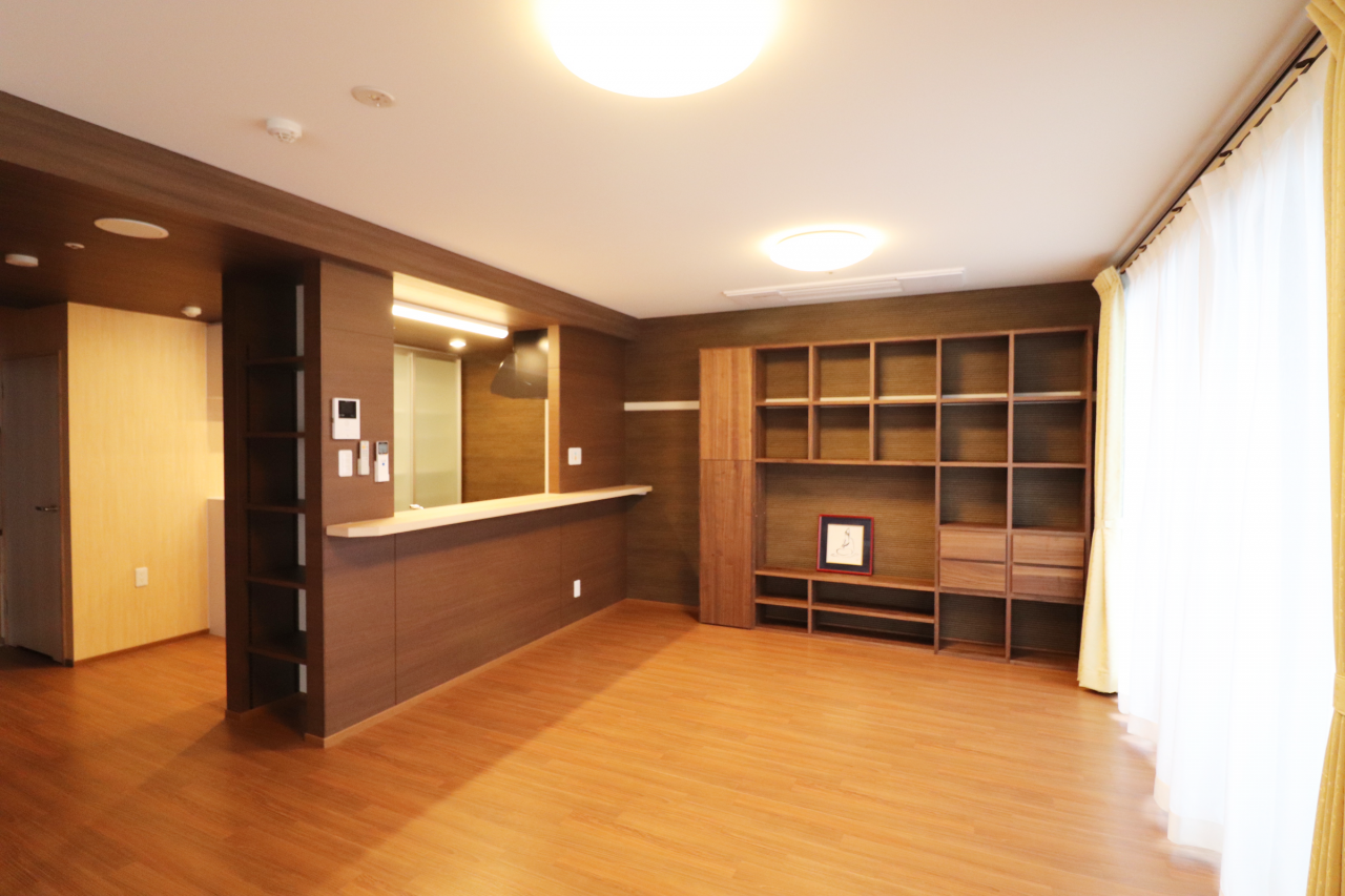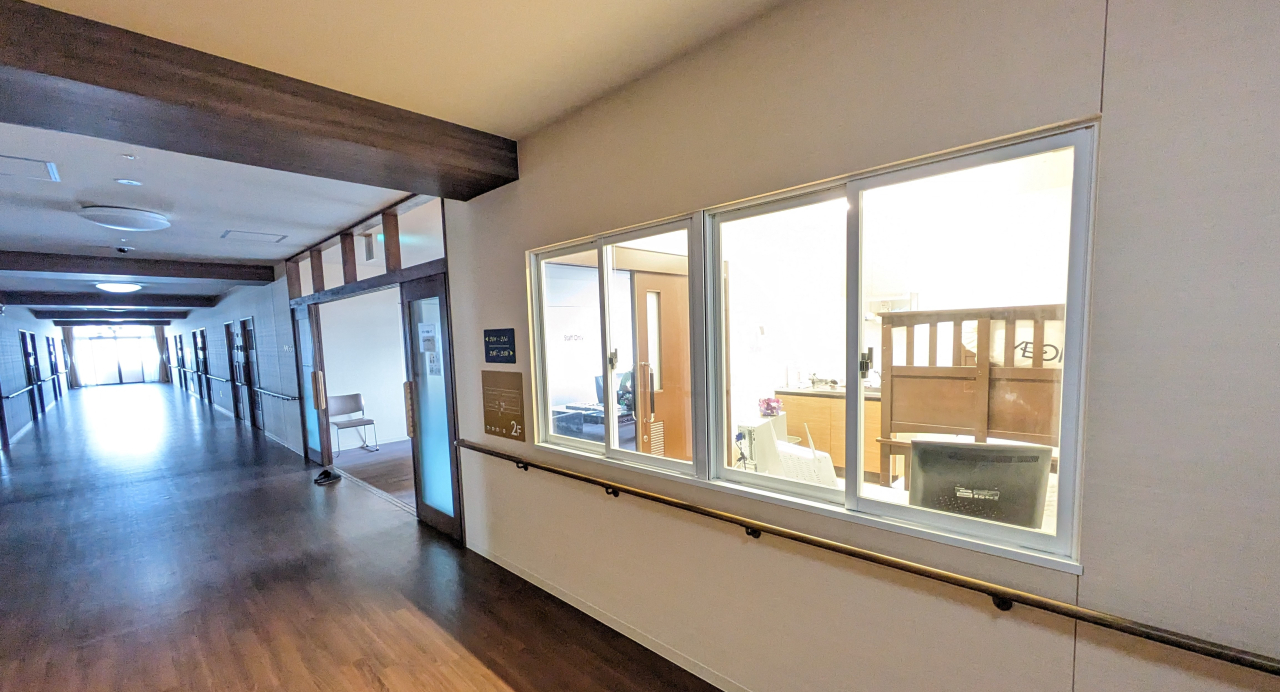 ラウンジの隣にあるヘルパーステーションは、廊下に面した部分が窓ガラスになっており、気軽にお声掛けいただける作りとなっております。