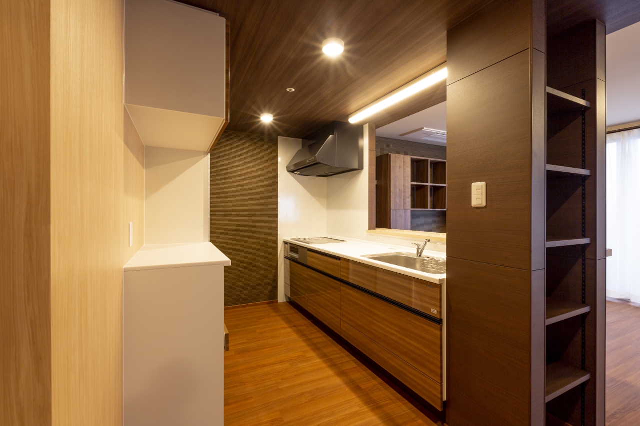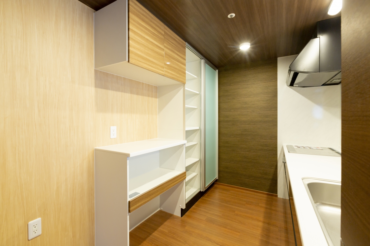キッチン壁面に備え付けの収納棚。食器も家電も収納可能。