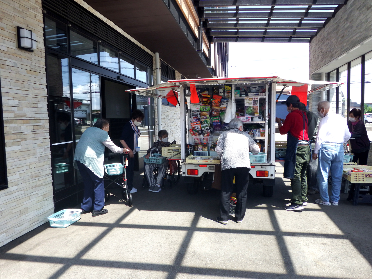 移動スーパーの「とくし丸」さん。定期で来てくれます。品揃えも多く、大変好評です。
