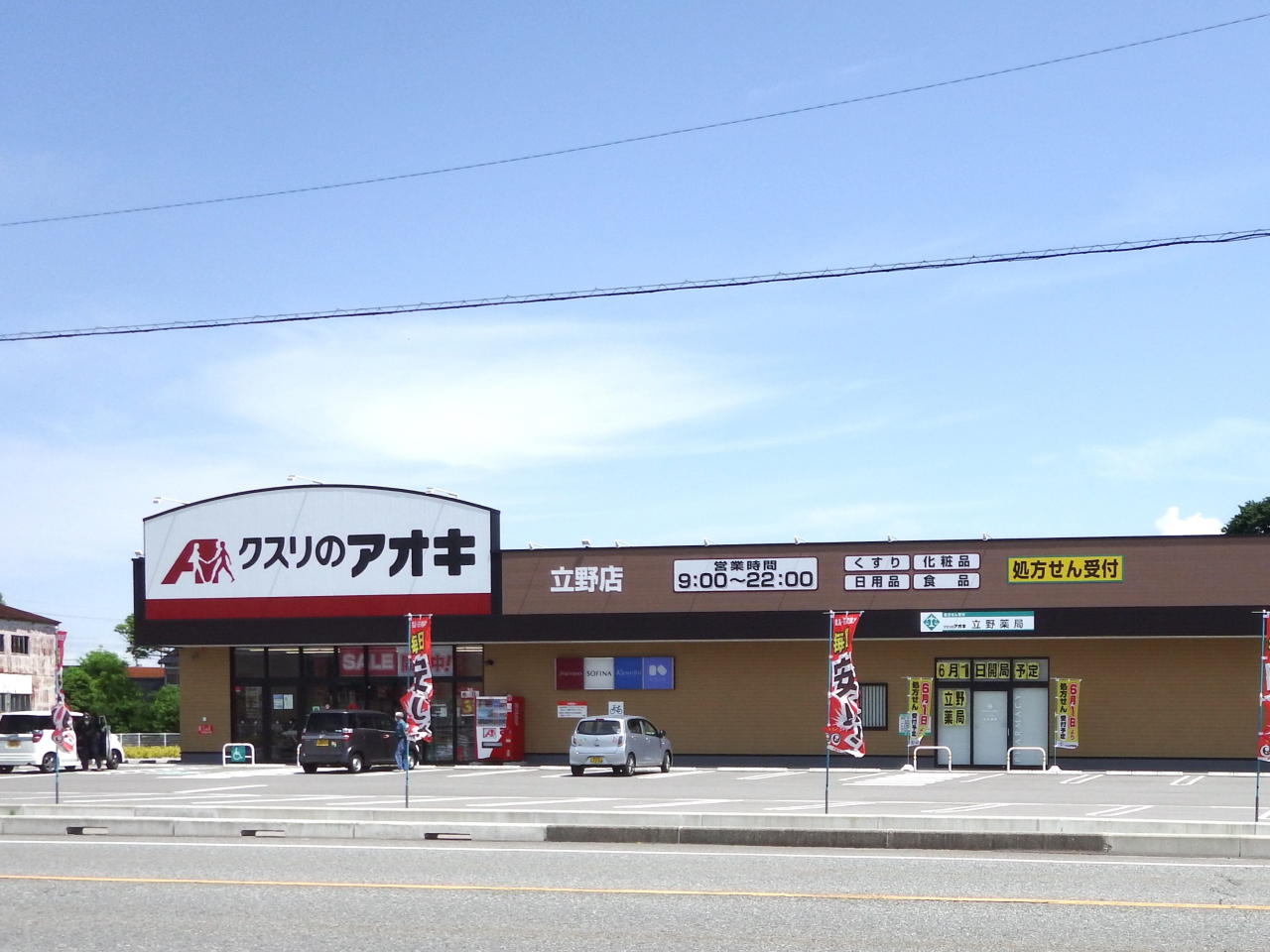 向かい側にあるクスリのアオキさん。営業時間は9:00~22:00までで定休日はございません。食品の取り扱いもあり、調剤薬局もございます。