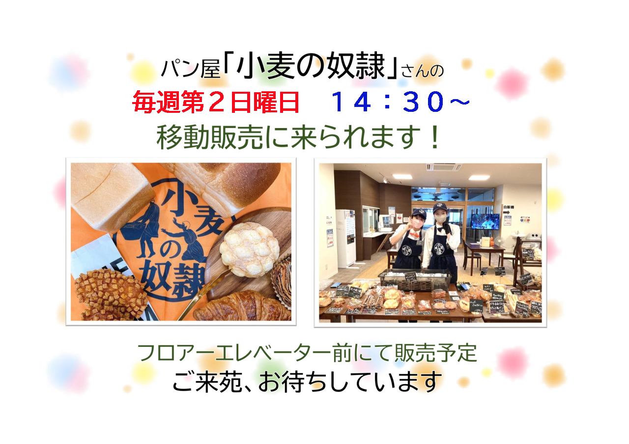 人気のパン屋さんの移動販売が併設のグランスパかの苑に定期的にございます。とても美味しいと大人気です。