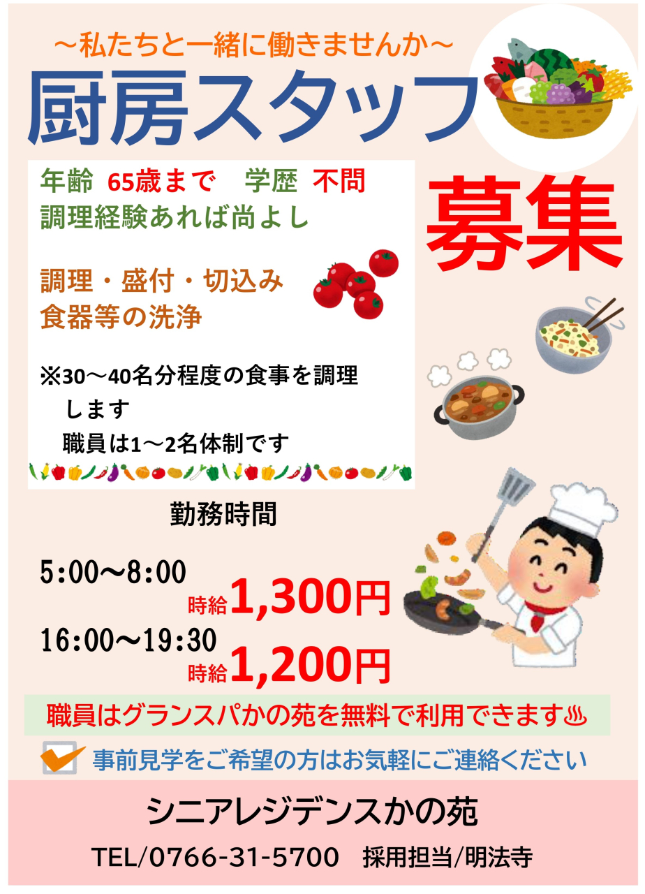 | 福利厚生 | ・退職金制度あり(試用期間終了後) ・各種社会保険完備 ・育児休業・介護休業制度あり(取得実績あり) ・グランスパかの苑の温泉が無料で入れます(職員のみ) |